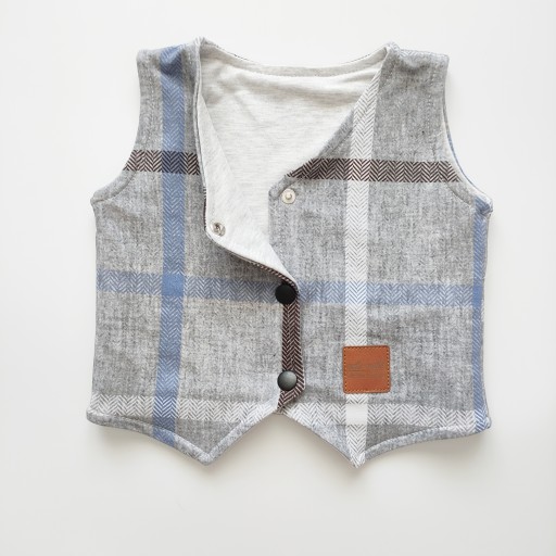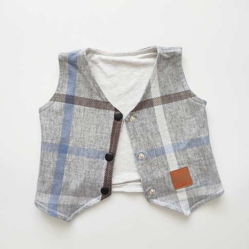 Елегантний синьо-коричневий жилет в клітинку для хлопчика на сірому тлі