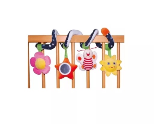На спіралі кріпляться 4 різних підвіски: сонечко з брязкальцем, метелик з шелестучими крилами, зірка з дзеркальцем з безпечного металізованого матеріалу і ніжно шелестить квітка. Його легко встановити на коляску або коляску - пральна машина обертається навколо поручнів або ручки в межах видимості малюка.