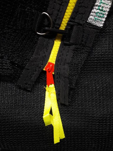 Сітка виходить за раму і кріпиться знизу гачками (на гумках) до трикутників поруч з батутним килимком. Міцна блискавка додатково закріплена пряжкою знизу. Важливо, щоб цю сітку не прив'язували до стовпів, а надягали на них спеціальні чохли. Завдяки цьому використовується вся поверхня батута, а піна на стовпах захищена від пошкоджень.