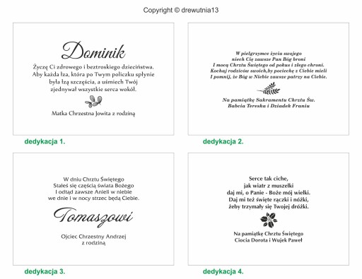 Ви можете надіслати нам свою присвяту, цитату, побажання всередині, а також власні тексти для гравіювання на міні-дошках: стопа, колесо, конюшина, серце на вибір.Тільки не забудьте уважно перевірити текст, який ви нам надсилаєте - чи є є будь-які помилки або букви - ми вигравіруємо саме те, що ви нам надішлете.