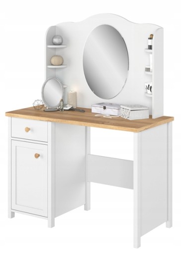 Письмовий стіл з надставкою - ідеальне поєднання для кожної елегантної жіночої кімнати. Оснащена великим дзеркалом овальної форми та невеликими поличками для косметики, прикрас та інших аксесуарів.