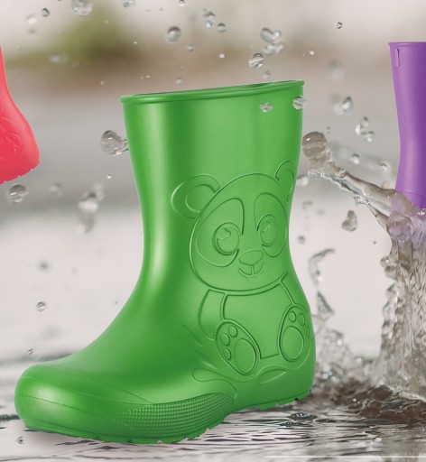 Чоботи для дітей виготовлені знадзвичайно легкий і гнучкий матеріалEVA. Це водостійка піна, наповнена бульбашками повітря. Завдяки цьому виріб надзвичайно легкий (важить лише пара гумових чобітприблизно 200 г) зручний і гнучкий, але міцний.