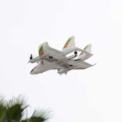 Літій-полімерний акумулятор високої ємності 11,1 В із часом польоту 15 хвилин і більше. Він використовує три безщіточні двигуни 1307 3000KV з високоефективними лопатями для повної потужності та чотири сервоприводи з цифровим керуванням, які використовуються для підтягування переднього двигуна та керування поверхнею керма літака.