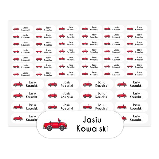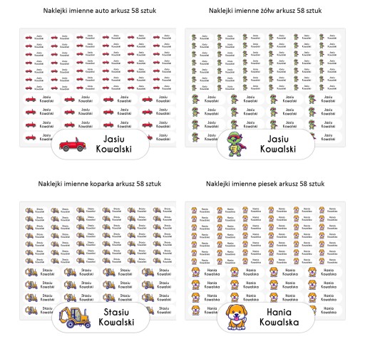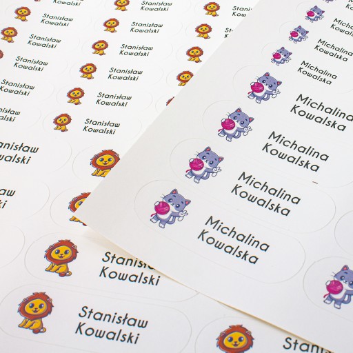 Набір з 58 іменних наклейокз надрукованим ім’ям та прізвищем вашої дитини, назвою класу, групи або номером телефону, його можна наносити на більшість підкладок: папір, картон, метал, пластик тощо.