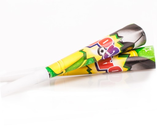 Труби виготовлені з картону, покритого лаком, і пластикового мундштука. Мають піке дизайн. Гаджет, який повинен мати кожен маленький фанат. Ідеально підходить для днів народжень тощо.