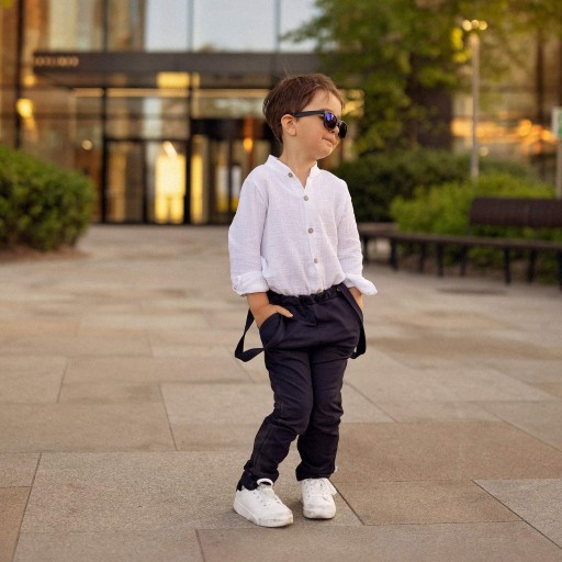 Спортивні штани темно-синього кольору виробництва Польща з м'якої бавовни. Штани дуже елегантні і стильні, і в той же час дуже зручні і приємні на дотик. М'який матеріал забезпечує малюкам найвищий рівень комфорту при носінні. Штани мають дві прорізні кишені спереду та підтяжки, що застібаються на декоративні дерев'яні гудзики. Такі прості темно-сині брюки добре поєднуються з офіційними стилями в поєднанні з елегантною футболкою.