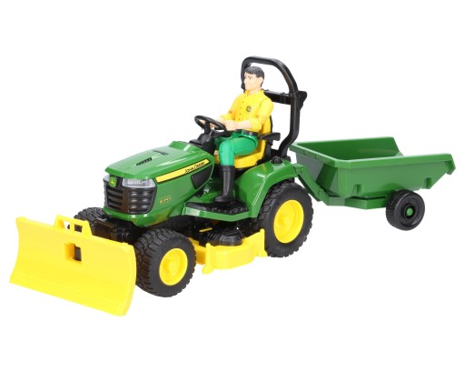 Іграшка Bruder - чудова копія мотокоси John Deere X949. Іграшка оснащена опускається робочою частиною, яка легко від'єднується і трансформується з косіння в роботу з невеликим трактором або снігоприбирання. Ця остання гра буде дуже реалістичною завдяки снігоприбиральній машині, що входить до набору. До трактора також йде невеликий причіп, який оснащений навісним відкиданням. За сидінням автомобіля знаходиться робоча вішалка, на яку можна розмістити садові аксесуари, такі як граблі, щітка і т. д. Трактор має м'які гумові шини. У набір також входить фігурка садівника, яка має рухомі кінцівки, які можна згинати, і її можна легко розмістити за елементами керування косаркою.