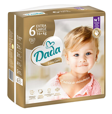 Нові покращені улюблені батьками підгузки відомого бренду DADA з серії EXTRA CARE, версія 6 EXTRA LARGE, адаптовані для дітей вагою 16+ кг, в комплекті з супер вологими серветками DADA EVERYDAY.