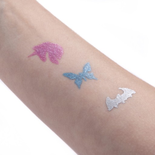 Гліттерні тату-маркери Kidea змінять ваш образ! У набір входить цілих 12 трафаретів, завдяки яким ви зробите ідеальне тату і 3 фломастери з блискітками (рожевий, блакитний, сріблястий) незвичайних металевих кольорів. Досить прикласти трафарет до будь-якого місця шкіри і розфарбувати його. Для видалення татуювання найкраще використовувати засіб для зняття макіяжу. Ідеально підходить для свят, маскарадних вечірок і карнавалів. Маркери безпечні у використанні, що підтверджено дерматологічними тестами.