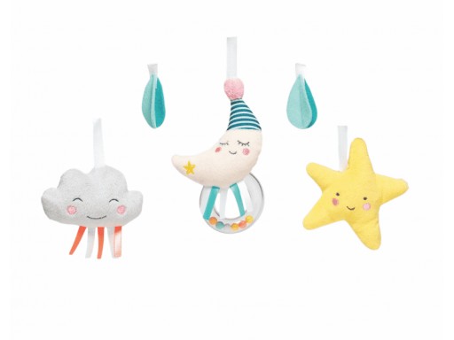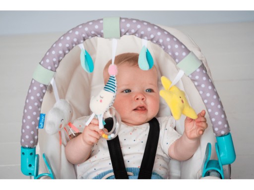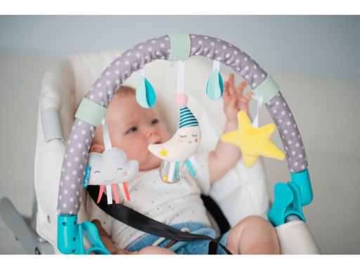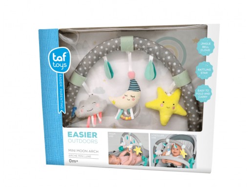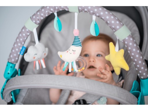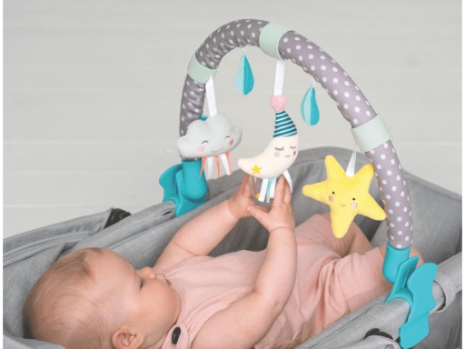 М'яка, гнучка коробка, повна атракціонів та ігор. Дуга має великий вплив на розвиток сенсорної та моторної координації, а також підтримує дрібну моторику дитини. Оснащений гнучкими затискачами, він легко встановлюється та адаптується до автомобільних сидінь і колясок.