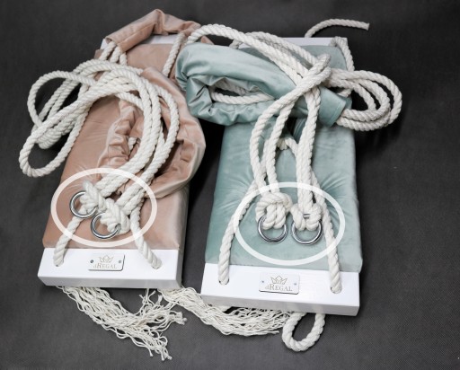- Ви можете самостійно регулювати висоту сидіння та рукавів, відв’язавши та зав’язавши лямки (тому ви отримуєте під сидінням гойдалки з розплетеними мотузками на стандартній висоті; встановивши відповідну висоту для дитини, можна/можна розв’яжіть мотузку, щоб створити декоративні китиці).