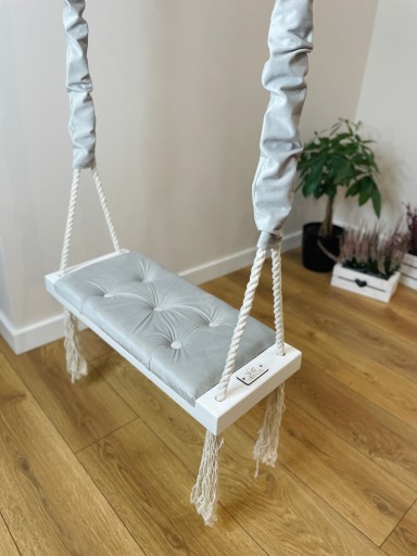 На аукціоні представлені дерев'яні гойдалки ПРЕМІУМ на бавовняних мотузках з м'яким сидінням СВІТЛО-СІРОГО кольору, виготовлені з пофарбованої сосни, м'яке сидіння, товсті мотузки, закінчені оцинкованим кільцем, і декоративні втулки. Все це гарантує міцну конструкцію, безпеку та стабільність.