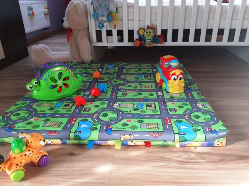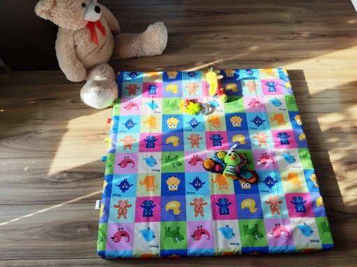 Використання матраца/килимка забезпечить дитині безпечне навчання сидіти, повзати та ходити, а в більш пізньому віці — вільні ігри будь-якими іграшками. На одній зі сторін є етикетки, які стимулюють психомоторний розвиток малюків і стимулюють почуття, і малюки люблять ними гратися!