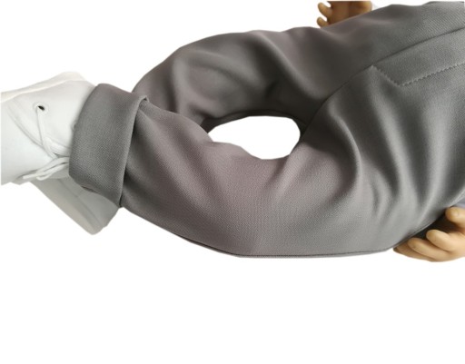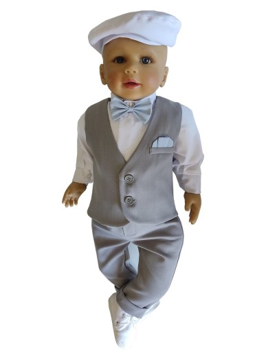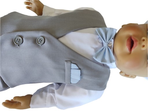 - ЖИЛЕТ СІРИЙ - З КОСТЮМНОЇ ТКАНИНИ, ЗАКРИВАЄТЬСЯ НА ДВА ГУДСКИ, ПРИКРОШЕНИЙ СИНІЙ КИШЕНЄЮ.