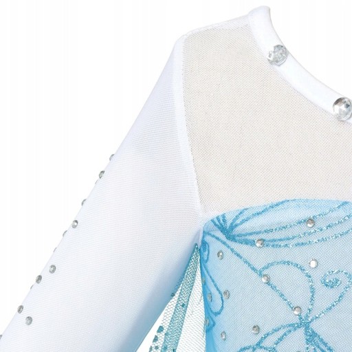 Сукня на корсеті вшита «ромбиками» у формі сніжинки, рукава вшиті з ніжного білого туману. Низ сукні складається з двох шарів: мерехтливого матеріалу і напівпрозорої сріблястої тканини. Вінчає роботу шлейф, що виблискує блискітками в танці.