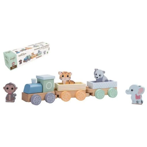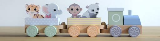 Дерев'яний пастельний поїзд складається з локомотива та двох вагонів і дерев'яних тварин: мавпи, тигра, панди та слона.