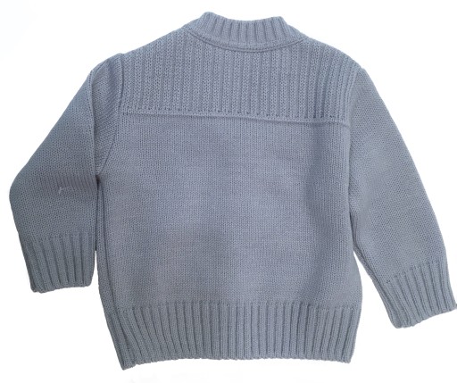 Светр сірого кольору застібається на гудзики, виріз - V-подібний.