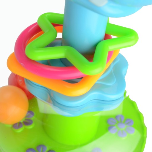 Дитина може доторкнутися до трьох різнокольорових кілець на шиї бегемота, обертати їх, рухати вгору та вниз.Таким чином дитина вчиться називати кольори та вивчає нові форми, такі як мах, квадрат і зірка. У прозорому череві бегемота є сім різнокольорових поверхів із мотивами листя та квітів. На кожному з них є маленькі печатки, всі різного кольору.Іграшка набуває сили одним рухом! Просто натисніть на голову тварини, і кульки всередині почнуть обертатися і стрибати. Це дуже просто і наповнює вашу дитину радістю!