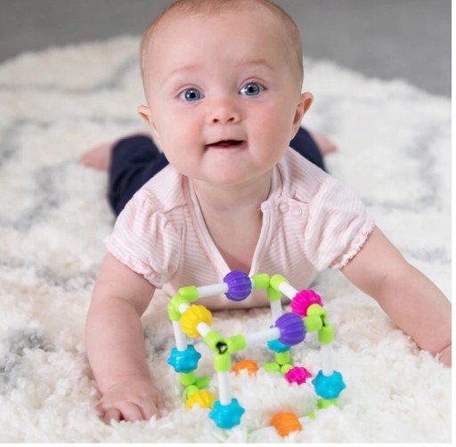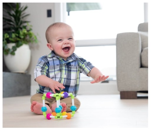 Кожен край Quubi Cube оснащений еластичними стрічками, щоб маленькі ручки могли їх стискати, згинати та крутити. Для додаткової сенсорної стимуляції та захоплення дитини різнокольорові гумові намистини ковзають і обертаються по краях кубика, ідеально підходять для кусання.
