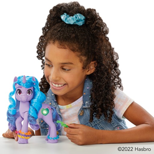 Відкрийте для себе магію єдинорогів разом із 15-сантиметровою фігуркою Іззі зі світловими ефектами, звуками та музикою! Натисніть Cutie Mark, щоб почути музику з My Little Pony: The Next Generation. Включає аксесуари для Іззі та дітей (6 різнокольорових браслетів дружби) і гребінець для розчісування чудового волосся єдинорога.