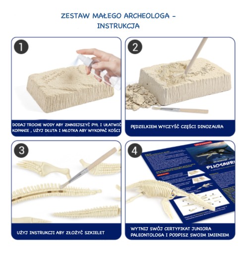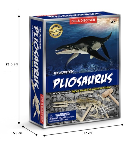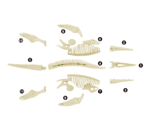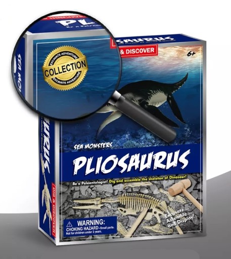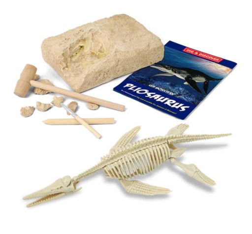 Набір для модного вченого. У блоці захований скелет динозавра, який потрібно викопати за допомогою інструментів, що входять у набір, а потім з’єднати кістки, щоб отримати скелет пліозавра.
