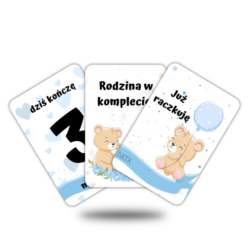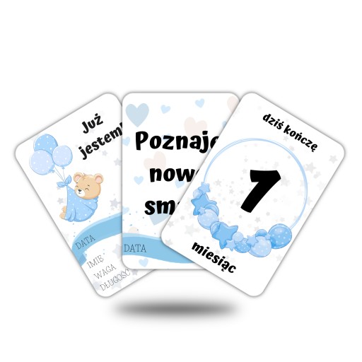 У набір входить 44 барвисті графічні композиції в стилі Teddy Bear Blue, надруковані на 22 картках. Картки універсального розміру 10х15 см (+/- 1мм), завдяки чому вони чудово підійдуть для фотографій з маленькою дитиною.