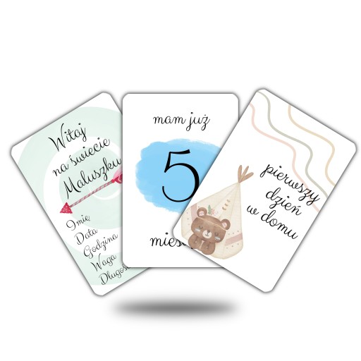 У набір входить 44 барвисті графічні композиції в стилі BOHO Watercolor, надруковані на 22 картках. Картки універсального розміру 10х15 см (+/- 1мм), завдяки чому вони чудово підійдуть для фотографій з маленькою дитиною.