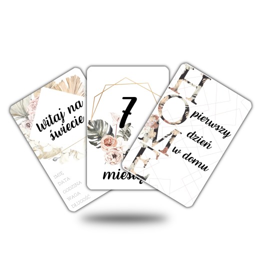 У набір входить 44 барвисті графічні композиції в тропічному кліматі BOHO, надруковані на 22 картках. Картки універсального розміру 10х15 см (+/- 1мм), завдяки чому вони чудово підійдуть для фотографій з маленькою дитиною.