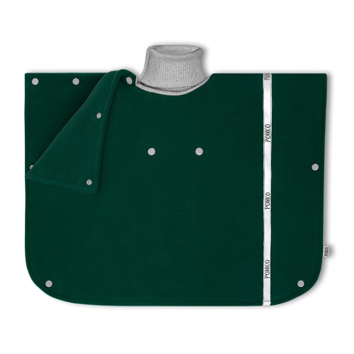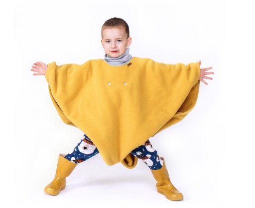 Пончо стандартного розміру виготовлені з приємного на дотик флісу, який забезпечує тепловий комфорт при відносно невеликій вазі. Практичне розстібається пончо з одного боку, а також відстібається водолазка під шиєю дозволяє легко одягати і знімати пончо як для однорічної, так і для трирічної дитини. Водолазка виготовлена з 95% бавовни та 5% еластану.