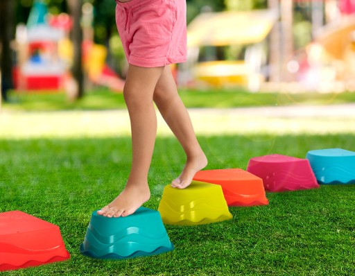 Розкладіть різнокольорові основи на підлозі/дворі/траві та переходьте від однієї до іншої або виберіть одну з пар, змотайте мотузки та ходіть, як на ходулях.