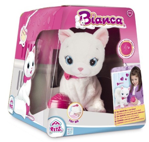 Знайомтеся з кошеням на ім’я Б’янка, яке любить грати з дітьми та своїм улюбленцем! Вона поводиться як справжнє кошеня, коли її кличеш, повертає голову, чухає спину, коли її гладиш, грається зі своїм вихованцем і муркоче пісеньку. Не треба чіпай її ліву лапу, їй це не подобається. ! Поставте штамп перед Б’янкою, і ви побачите, як вона йде грати. Щоб привернути увагу, він буде рухатися і шуміти.