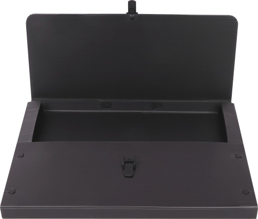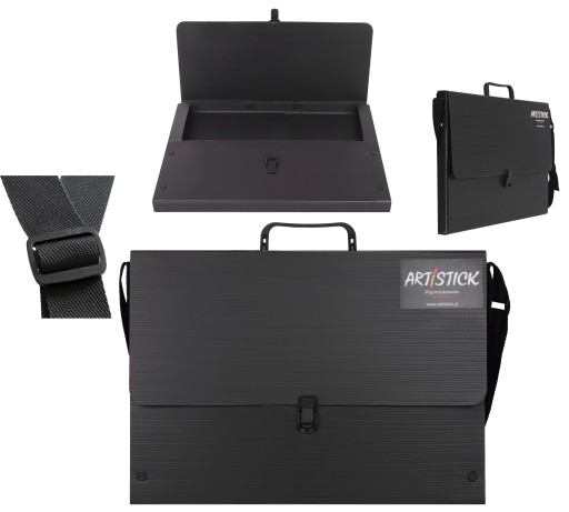 Чорна поліпропіленова папка для креслень формату А3. Ідеально підходить для зберігання та транспортування креслень документів. Портфель має регульований ремінь, що полегшує його перенесення. Портфель також має зручну ручку. Папка також оснащена застібкою для закриття. Виготовлений з пустотілої плити товщиною 3 мм. Має УФ та антистатичну добавку.