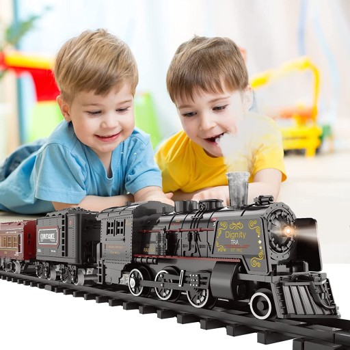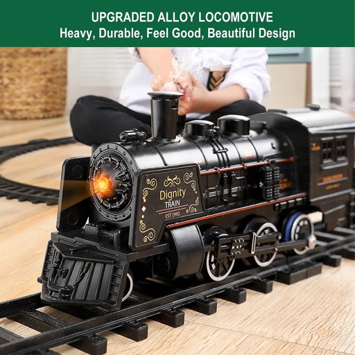 ????【Реалістичні фари, звуки та дим】: цей комплект електропоїзда створено відповідно до найреалістичнішої форми поїзда, відновлюючи кожну деталь. Поїзд-локомотив оснащений свистком і функцією освітлення та диму. Коли іграшковий поїзд рухається, він видає справжні звуки поїзда, працює фари та реалістичний дим, а пасажирські вагони наповнюються теплим світлом, що робить наші електропоїзди для хлопчиків 4-7 років більш реалістичними та веселими, ніж інші. ????【Матеріал сплаву, безпечний і міцний】: Паровоз виготовлено зі сплаву, який не є токсичним і несмачним, і кожен шматок пройшов сувору перевірку якості, він достатньо безпечний для дітей. Порівняно з пластиковими потягами на Amazon, наші легкосплавні потяги міцніші та ударостійкі. Гладкий дизайн шлейфів для хлопчиків 3-5 років приємний на дотик і не завдасть шкоди рукам і тілу дитини. Ви можете грати зі своїми дітьми без будь-яких турбот.