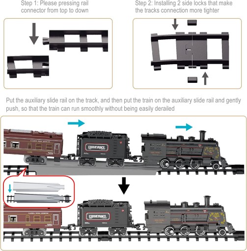 【Новий класичний набір залізничних колій】: набір поїздів включає 1 легкосплавний паровий локомотив, 1 вагон для вугілля та 2 пасажирські вагони з ліхтарями, 8 вигнутих і 4 прямі колії. Увімкніть потяг і готуйтеся вирушати на веселі траси. Розмір: 51,2 дюйма (Д) x 30,7 дюйма (Ш) довга овальна схема доріжки. Для двигуна локомотива потрібні 4 батарейки АА, в комплект не входять.