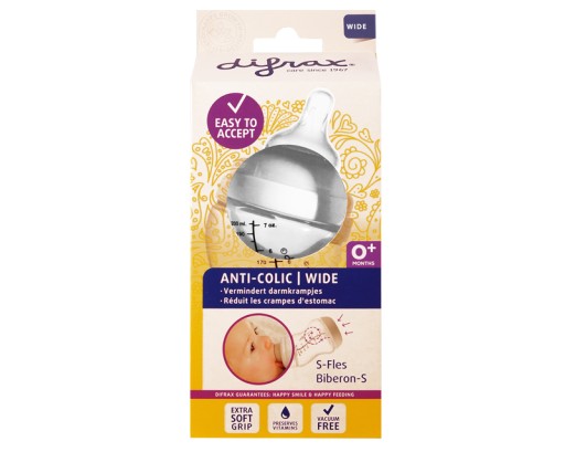 Пляшка Difrax S-baby Wide 200 мл протягом багатьох років була найпопулярнішою пляшкою для немовлят, мам і тат завдяки унікальному антиколіковому клапану та S-подібній пляшці. Поєднання цих двох особливостей забезпечує постійне та регулярне надходження Годує не ковтаючи молоко дитиною. Антиколікова пляшечка S-baby може використовуватися з народження і є перевіреним поєднанням з грудним вигодовуванням, а також дуже підходить для молочної каші.
