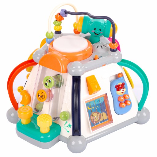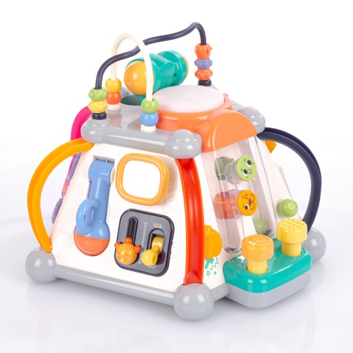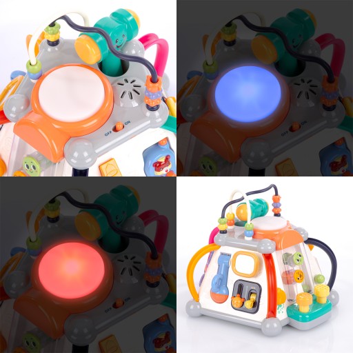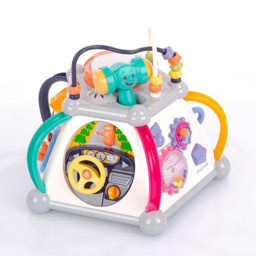 Інтерактивний куб спрямований на навчання через гру. Іграшка займе час вашого малюка. є найкращими властивостями ручних іграшок та іграшок, які розвивають мислення. Куб має п'ять кольорових граней і додаткову верхню з лабіринтом.