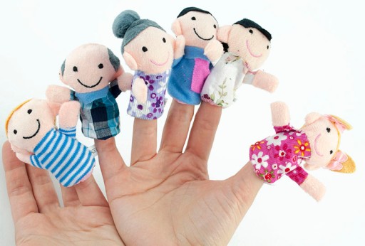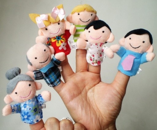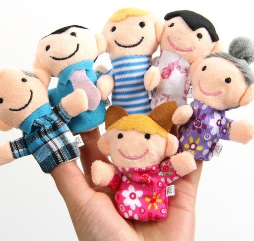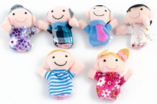 Шість різнокольорових ручних ляльок - сім'я: тато, мама, бабуся, дідусь, дочка, син.