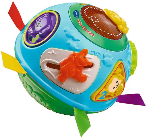 М'яч Spryciula від Vtech - це інтерактивна розвиваюча іграшка для дітей від 6 місяців, яка викликає цікавість і бажання пізнавати світ. Іграшка оснащена механізмом, який автоматично приводить м'яч в рух і спонукає малюка повзати і пасувати за ним. Натискаючи різнокольорові кнопки, дитина вивчає кольори та форми, а після натискання кнопок із тваринами почує характерні для них звуки.