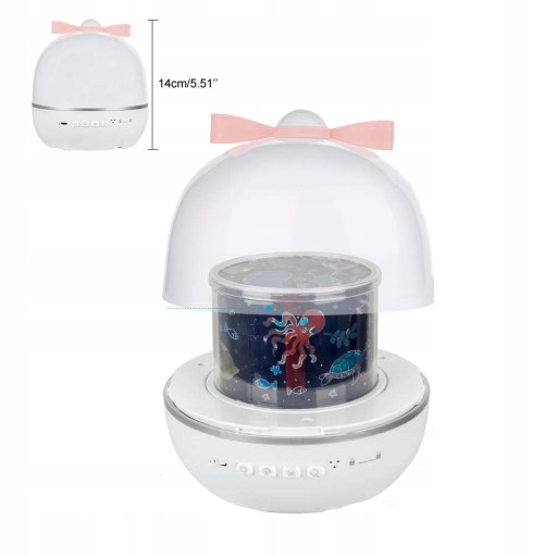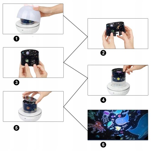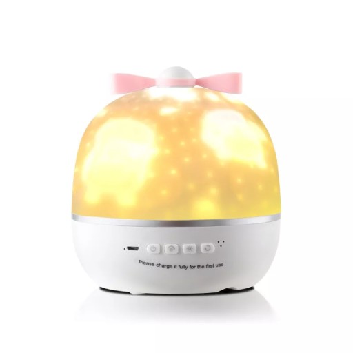Динамічна проекція 6 кольорів: на передній частині нічника є 4 кнопки. Кнопка 1: увімк./вимк Кнопка 2: Рівень яскравості, 3 регульовані рівні яскравості, встановлюючи найвищу яскравість для читання та найнижчу для сну. Кнопка 3: зміна кольору: синій, задній, білий, суцільний, повільно зникає та змішується, за потреби ви можете вибрати між одноколірним або змішаним кольорами. Кнопка 4: керування обертанням.