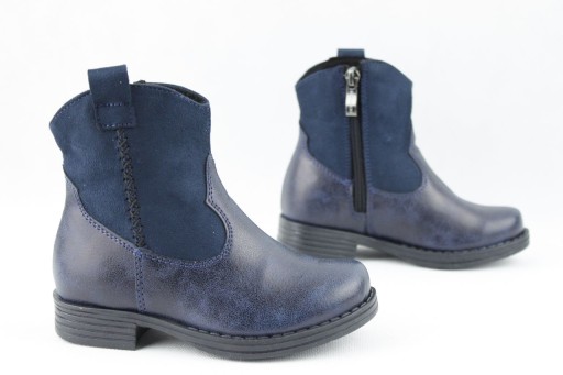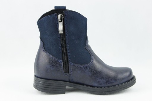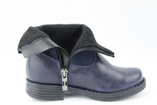 Чоботи для дівчинки темно-синього кольору від виробника взуття KORNECKI з екологічної шкіри. Взуття застібається на блискавку. Центр повністю ізольований.