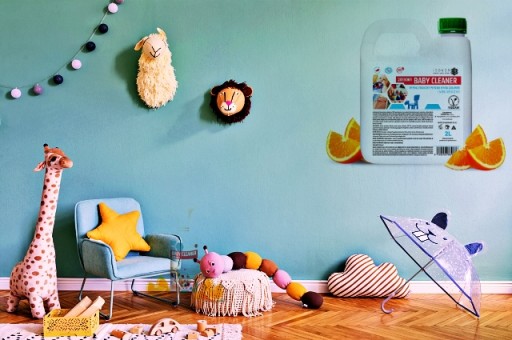 Ефективно видаляє різні типи забруднень: бруд, пил, плями тощо. Залишає іграшки, меблі та поверхні навколо дитини гігієнічними та чистими. Ідеально підходить для миття іграшок, дитячих меблів, поручнів, столиків для годування, пеленальних столиків, горщиків та контейнерів для іграшок. Його також можна використовувати для прання матраца, коляски, автокрісла, розвиваючих килимків або іграшок. Діти можуть торкатися іграшок і безпечно грати одразу після використання. Дуже добре справляється зі стійкими плямами сечі, соку, молока та жиру. Усуває неприємні запахи. Він безпечний для дітей і дорослих. Його можна використовувати в кожному домі, а також у навчальних закладах, спеціалізованих клініках, сенсорних клініках, ігрових кімнатах, кафе та ігрових куточках.