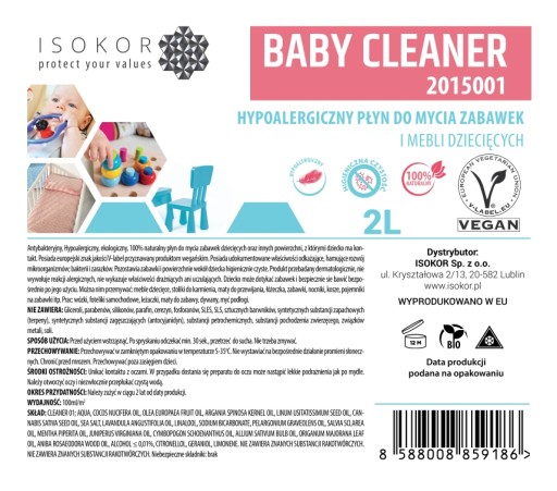 Безпечна, гіпоалергенна, що складається з 100% натуральних інгредієнтів рідина для миття дитячих іграшок, аксесуарів, меблів, текстилю та інших поверхонь, з якими контактують діти. Має європейський знак якості V-Label для веганських продуктів.