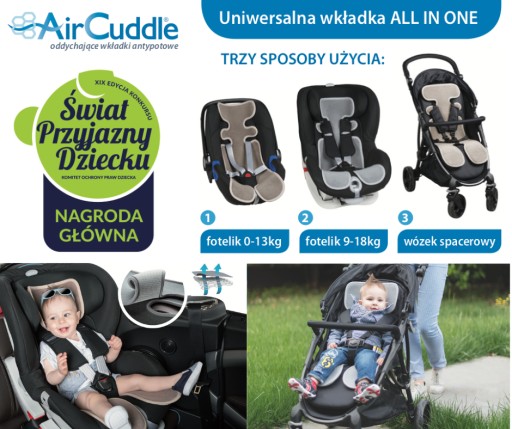 Завдяки AirCuddle ваша дитина подорожуватиме в автокріслах категорій 0-13 кг і 9-18 кг, а також у колясці комфортно без мокрої спини, одягу та волосся.