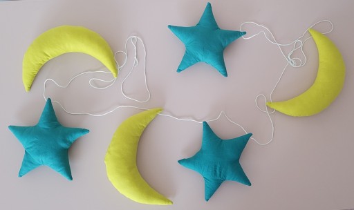 Наприклад: 2 зірки світло-сірі (або № 3), 2 хмари білі (або № 1), 2 місяці світлі r (або № 2). Заглушка кювета 150см. По порядку: зірка, місяць, хмара.