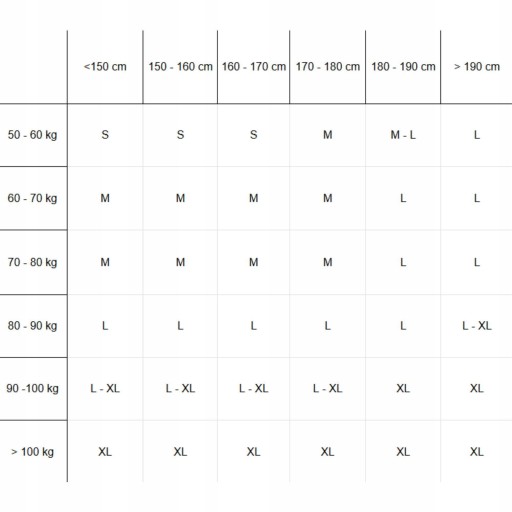 Розмір L, зріст приблизно 150 - 190 см або вага приблизно 80 - 90 кг.