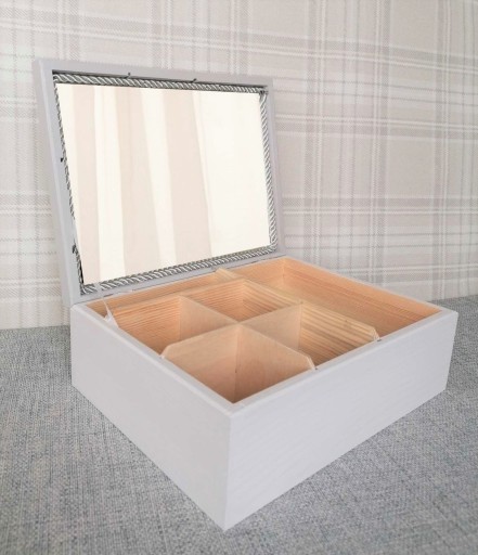 Кришка ящика пофарбована в світло-сірий колір, а стінки білі.