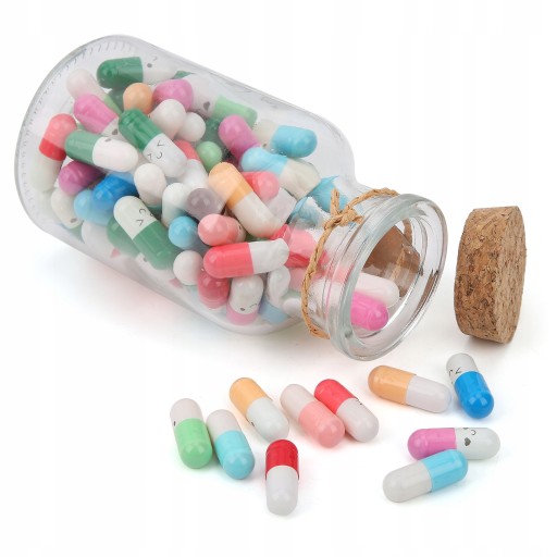 1. 1 скляна пляшка, 100 симпатичних капсул, у кожній капсулі є папір для нотаток, на папері немає інформації.