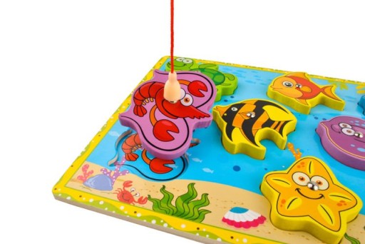 НАВЧАЄ- в набір входить дошка, на якій розташовані 8 водних тварин з металевими шпильками, в набір входить вудка, якою можна знімати тварин з дошки, магніти дуже сильні, тому навіть 3-річна дитина справляється з риболовлею без проблем.
