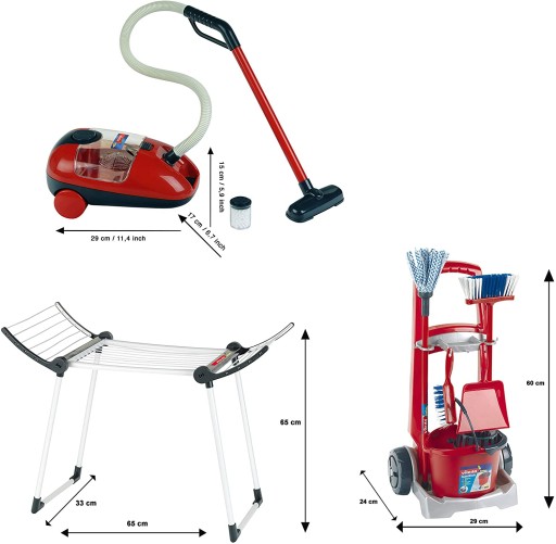 Зроблено в Німеччині: розміри сушарки: 33 см x 65 см x 50 см візок для мітли Розміри: 29 см x 24 см x 60 см Розміри пилососа: 17 см x 29 см x 15 см: підходить для дітей віком від 3 років