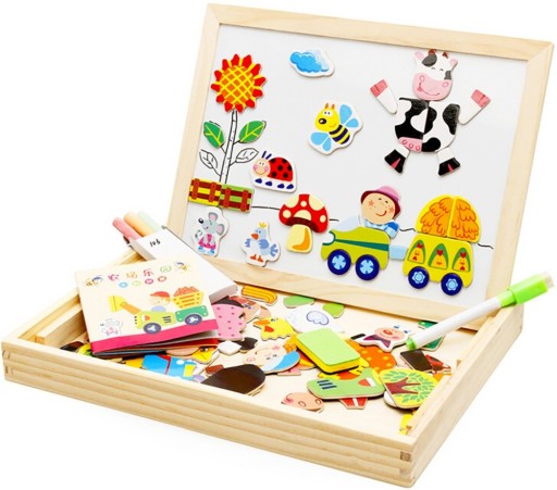 Магнітна дошка - продукт, орієнтований на дітей, які люблять творчо проводити час. Іграшка має подвійне використання. На білому боці ми можемо малювати сухостираними фломастерами та складати магнітні пазли, а на чорному – малювати крейдою. Дошку можна розмістити в дерев'яній підставці, яку також можна використовувати як місце для зберігання деталей пазла, фломастерів, крейди тощо.